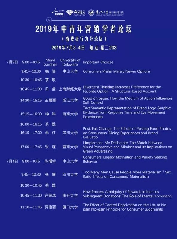 2019年7月3日到4日,厦门大学管理学院市场学系举办2019年中青年营销学者论坛。本次论坛邀请了国内外知名高校的中青年学者齐聚一堂,设“消费者行为”和“营销战略与模型”两个分论坛,以论文报告和讨论的形式对受邀学者的工作论文进行学术研讨。
