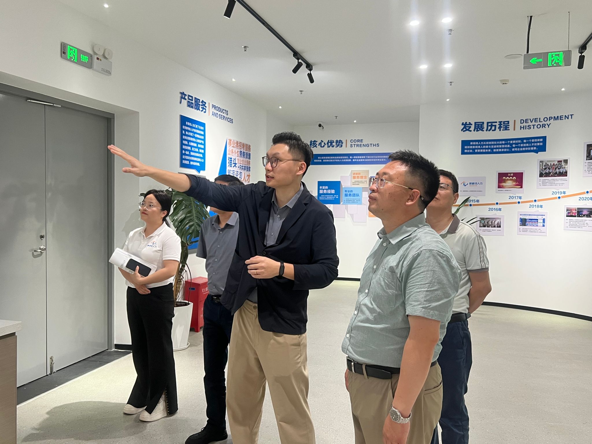 在举行调研座谈前,付景涛副院长一行对新视线人力集团办公区域及业务展示区进行参观学习。