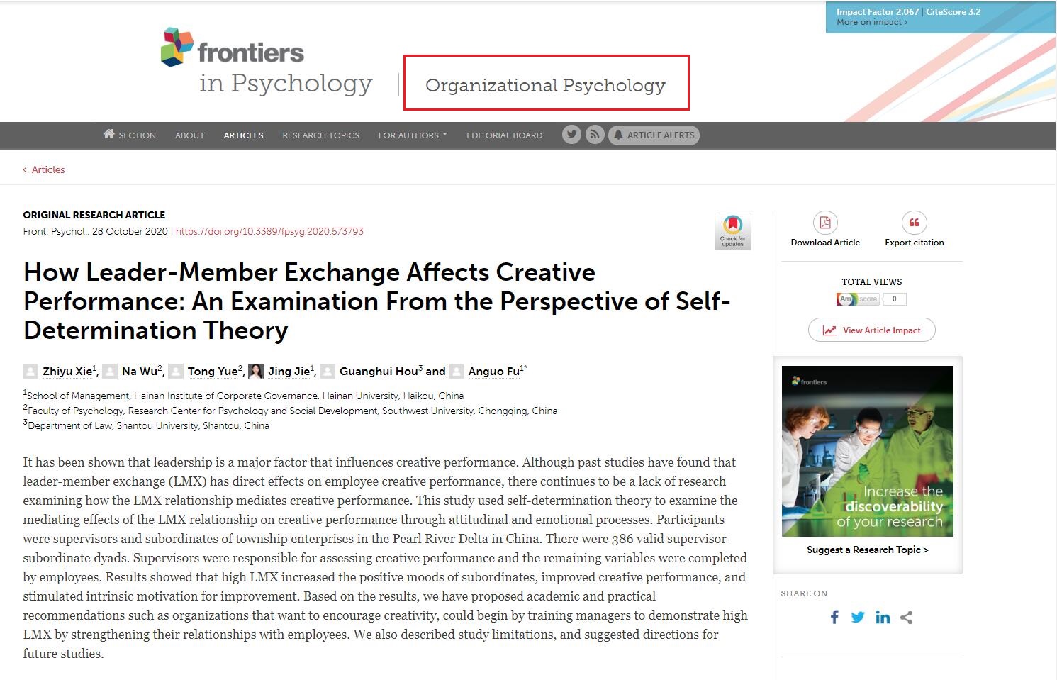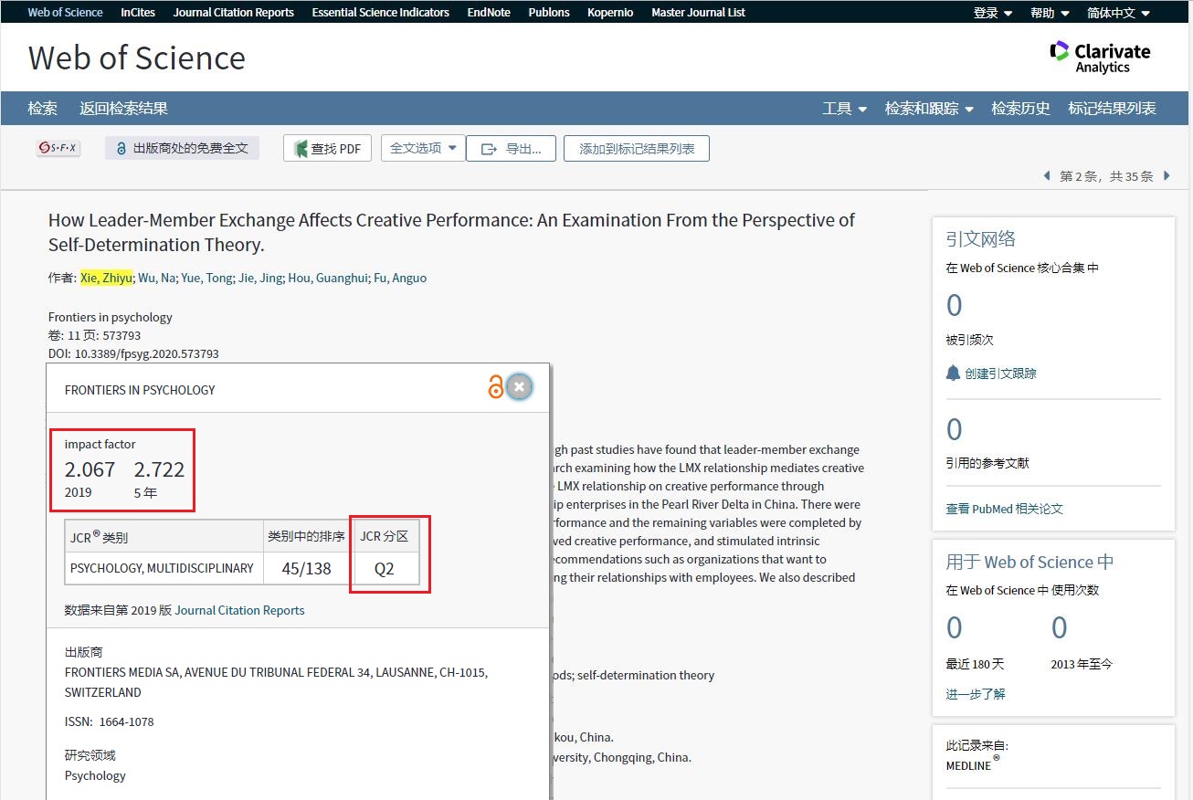 近日,管理学院硕士研究生解智宇以第一作者在国际学术期刊Frontiers in psychology: Organizational Psychology(SSCI二区,IF=2.067)上发表了题为“How Leader-Member Exchange Affects Creative Performance: An Examination From the Perspective of Self-Determination Theory”的研究论文(doi: 10.3389/fpsyg.2020.573793) ,这是水仙直播