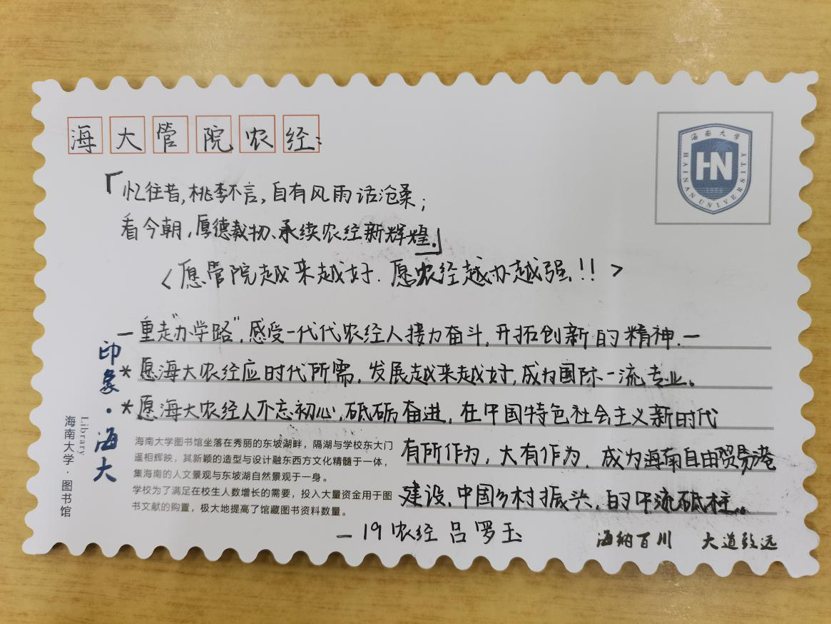 最后,师生们交换了明信片,并互送祝福,共同祝愿管理学院越办越好,越来越强,共同期盼管院人成为中国乡村振兴、海南自由贸易港建设的中流砥柱。