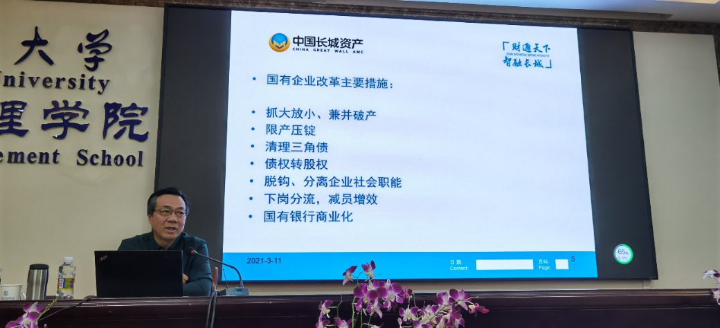 管理学院,在社科楼B112会议室发表了“中国金融资产公司发展之路”的主题讲座。本次讲座在许能锐副院长主持,部分管理学院教师、本科生和研究生到场聆听。