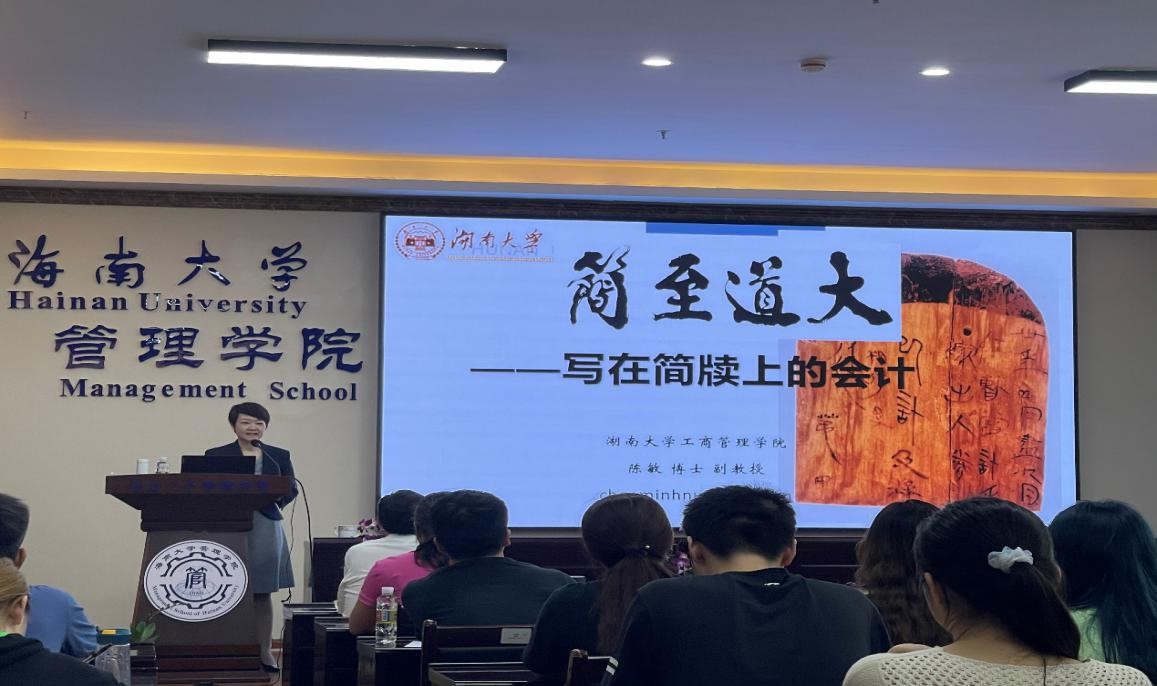陈教授引用老子《道德经》中的“万物之始,大道至简,衍化至繁”,结合国内外有关会计的古文物介绍,将会计历史研究娓娓道来。接着,陈教授梳理了中国古代文字记录从旧石器时代到简牍时代的演变过程,介绍了中国出土简牍账簿史料情况以及湖南出土简牍账簿史料研究情况,展示了不同类别的会计简照片,生动讲解了上面的记录会计历史情况。最后,陈教授总结了她近些年关于简牍方面的研究,分为商道、战道、王道,并分享了老师自身的感悟“大道至简,衍化至繁,会计之简,亦简亦繁”,引发同学们的思考。