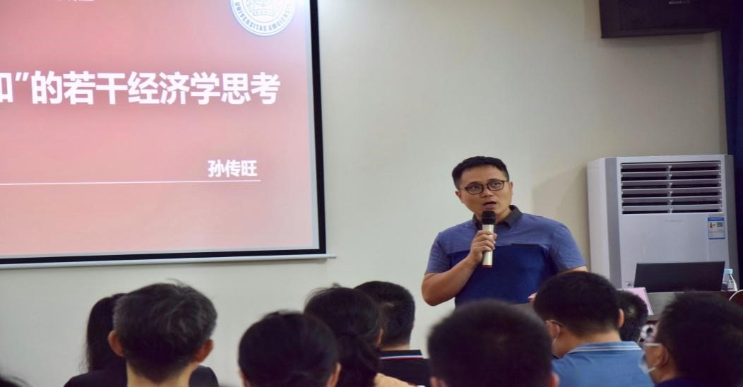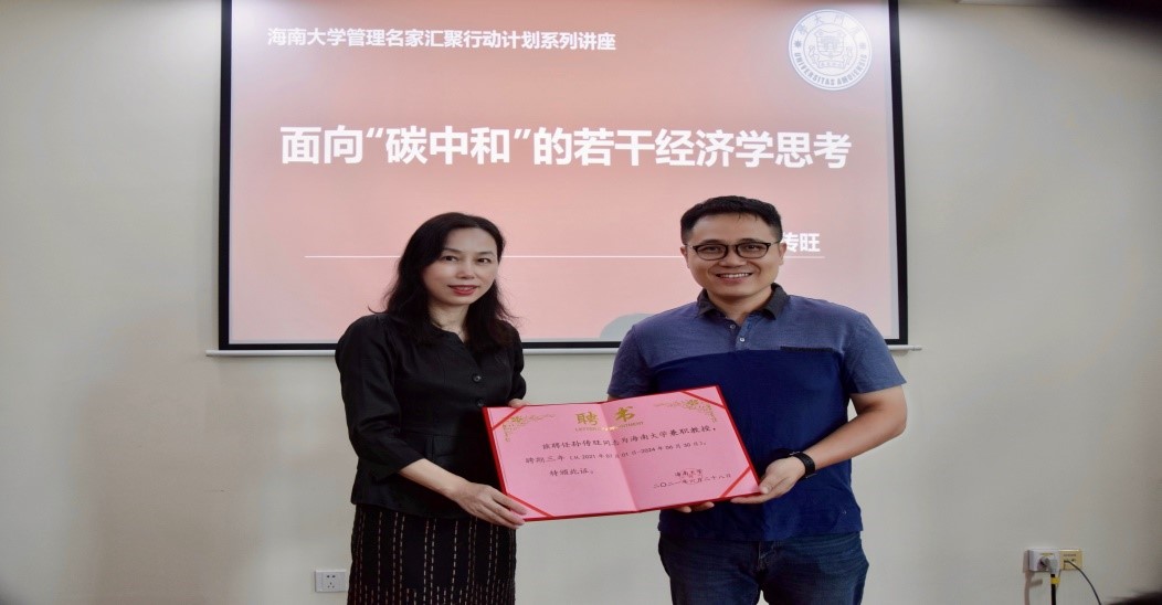兼职教授特聘仪式暨《面向“碳中和”的若干经济学思考》学术讲座在社科楼B308会议室隆重举行。管理学院唐宁玉院长出席活动并为孙传旺教授颁发聘书。唐宁玉院长、许能锐副院长、张德生副院长、赵达副院长以及管理学院部分师生参加,本次活动由张德生副院长主持。