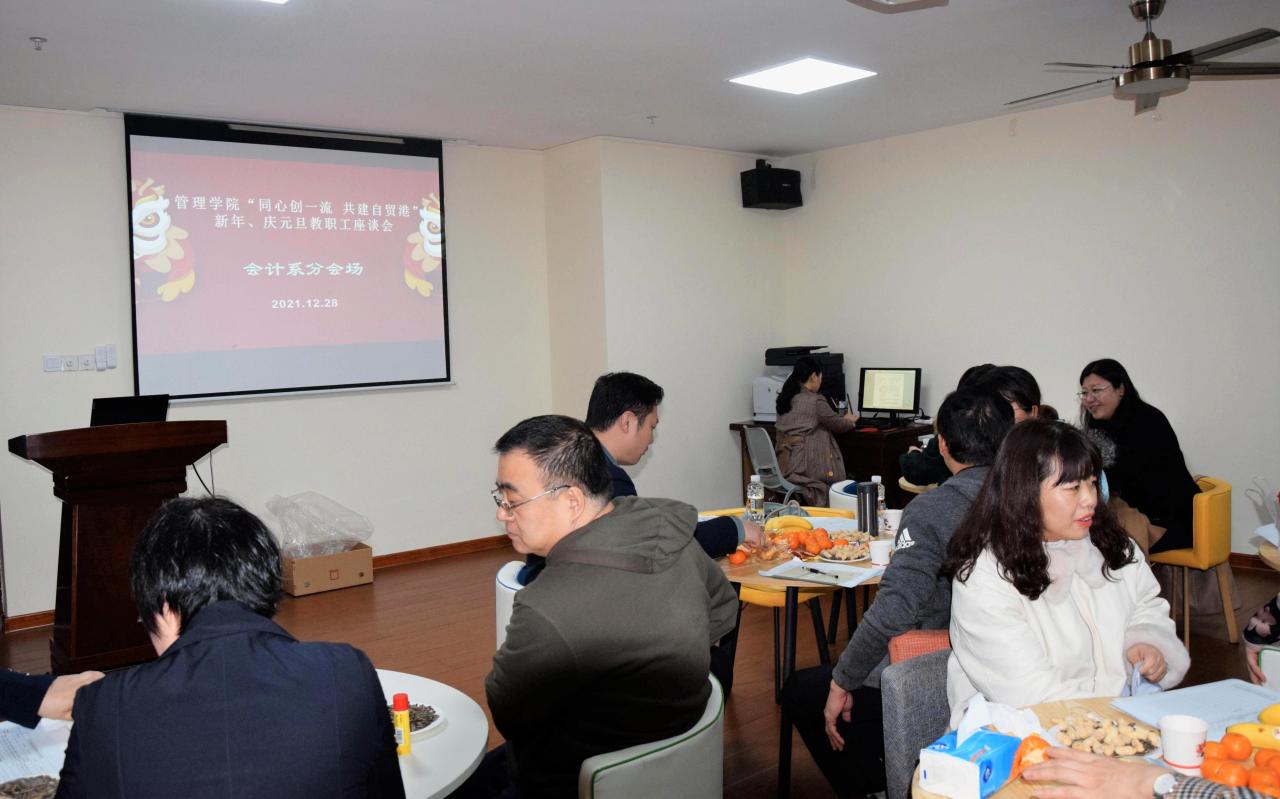 2021年12月28日下午,管理学院举行“同心创一流 共建自贸港”迎新年、庆元旦教职工座谈会。本次座谈会由学院工会组织承办,共分为五个分会场,包括工商管理系、会计系、农林经济管理系、管理科学与工程系以及综合管理分会场。全体教职工参加活动。