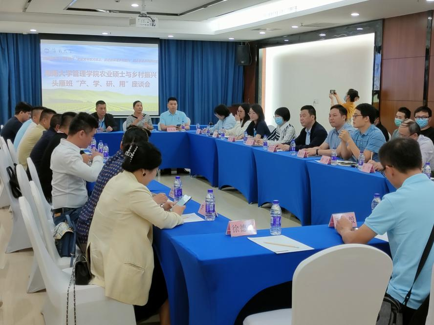 海南省海口市秀英区农业协会会长吴礼奋作为头雁班代表发言。“有机出口茶”符小芳、“直播带货”钟丰吉、“绿色有机蔬菜”廖之锋、“木薯电子商务”陈修宁、“哈密瓜全产业链”陈跃军、“白沙蜂蜜”高胜章、“妃子笑荔枝”彭海波、“农业机械化”王上南、“花卉睡莲”徐德喜、“农副深加工”徐丽娜、“共享农庄”刘军等等头雁班成员对自己的农业产业进行了深度的分享交流。系主任邓须军、王芳副教授、朱月季副教授、硕士研究生霍礼鑫和王颖等与头雁班各位成员在答疑解惑环节,就“如何应对疫情对农业发展冲击”、“失地农户再就业”、“自贸港背景下农副产品的进一步发展方向”等问题进行了深度的探讨与交流。在校的农业硕士研究生也积极参与了相关讨论。