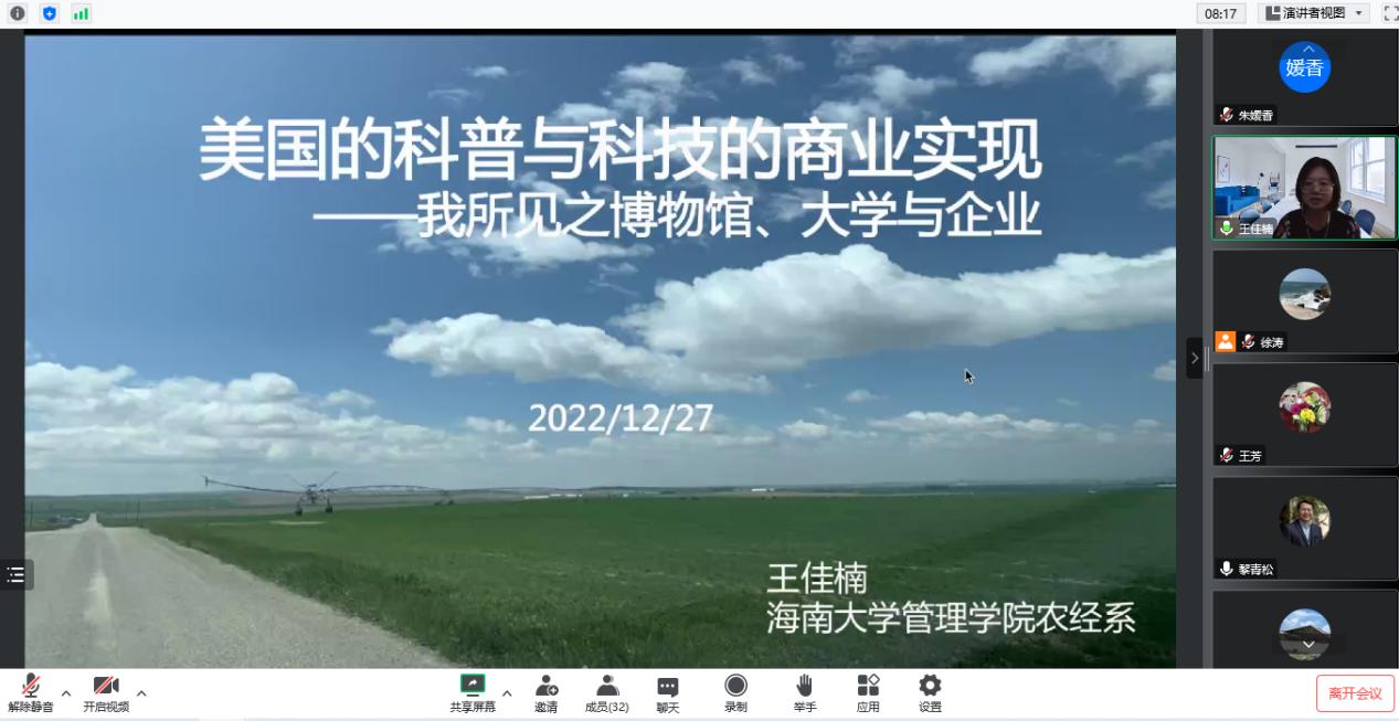 12月27日下午,尖峰热带农经驿站第1期邀请到管理学院农经系王佳楠副教授作了主题为《美国的科普与科技的商业实现——我所见之博物馆、大学与企业》的访学报告。报告会由农经系副系主任徐涛主持,水仙直播