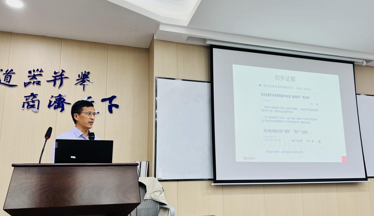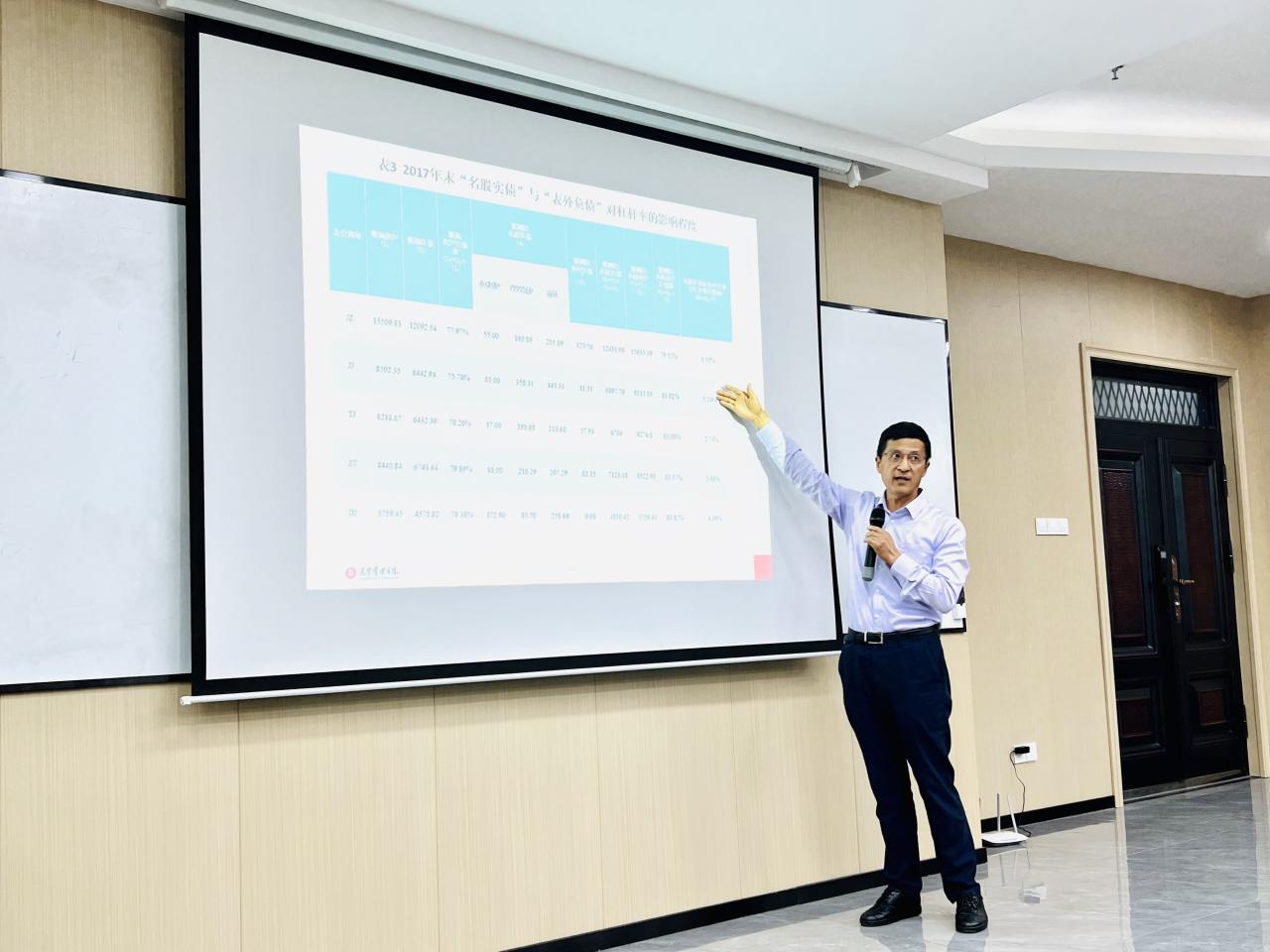 陆正飞教授分别从我国企业的过度负债问题、去杠杆与杠杆操纵、社会融资结构与过度投资三个方面进行了讨论。第一个方面,陆教授通过回顾2001—2020年间我国上市公司的总体杠杆水平,细致分析不同行业和产权性质下的杠杆水平,启发学生对“国有企业与非国有企业,谁更过度负债?”这一问题的深入思考,从长期动态和短期静态视角分析,揭露出政府隐性担保在国有企业降低过度负债风险的作用。第二个方面,从去杠杆的效果上看,我国政府的去杠杆政策基本达到了预期目标,但还存在央企、国企去杠杆程度不足,部分治理能力差的企业采用“非正常”方式去杠杆等问题。陆教授逐个分析了表外负债、名股实债与会计计量等3种常见的杠杆操纵手段,通过对企业杠杆操纵的会计后果分析,进一步说明抑制企业杠杆操纵的必要性。第三个方面,陆老师最新研究发现社会融资规模对企业过度投资程度产生显著影响,企业所在地区社融贷款比越高,则企业过度投资程度越大。他认为为了更好地支持实体经济发展,提高资金配置效率,必须大力发展直接融资,适当降低间接融资比例。