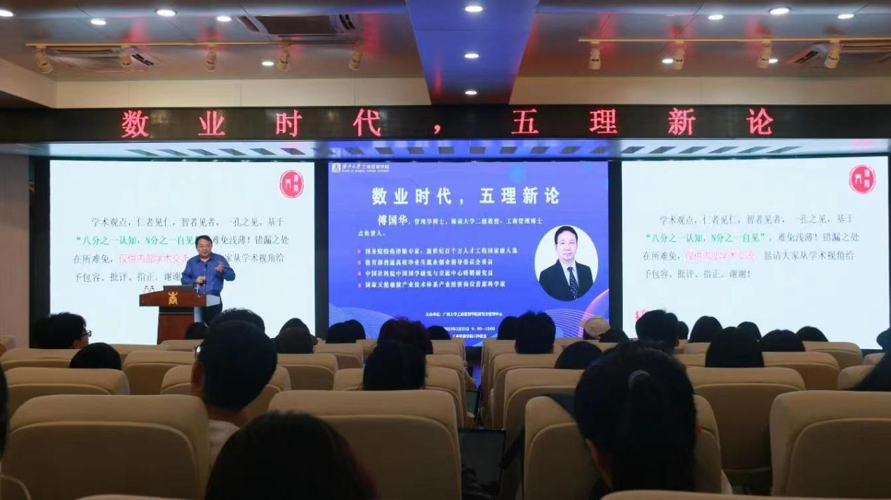 3月23日,傅国华教授受邀为广西大学工商管理学院师生分别作《数业时代,五理新论》和《分类分层次管理理论创新》两场主题学术讲座。他系统地阐述了其“数业社会、数业经济、数业文明”的学术构想,并提出人类社会将从农业社会、工业社会向数业社会迈进。他认为,通过“五理新论”即道理、伦理、治理、管理、处理的管理共性理论体系可以促进数业经济的发展,服务数业社会。此外,他深入浅出地阐明了“五理新论”这一分类分层次管理理论的具体应用,强调在管理实践中要做到分类分层次精准施策,通过差异识别避免错层管理,提高管理效率。