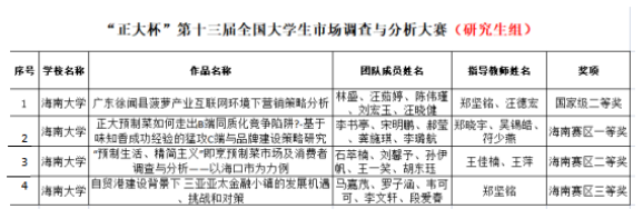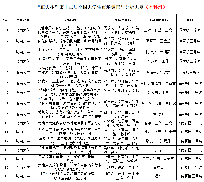 管理学院学生在5月28日闭幕的“正大杯”第十三届全国大学生市场调查与分析大赛中荣获佳绩。20项参赛作品获得奖项,其中研究生组和本科生组获国家级二等奖各1项,本科生组获国家级三等奖4项,海南赛区奖项14项。
