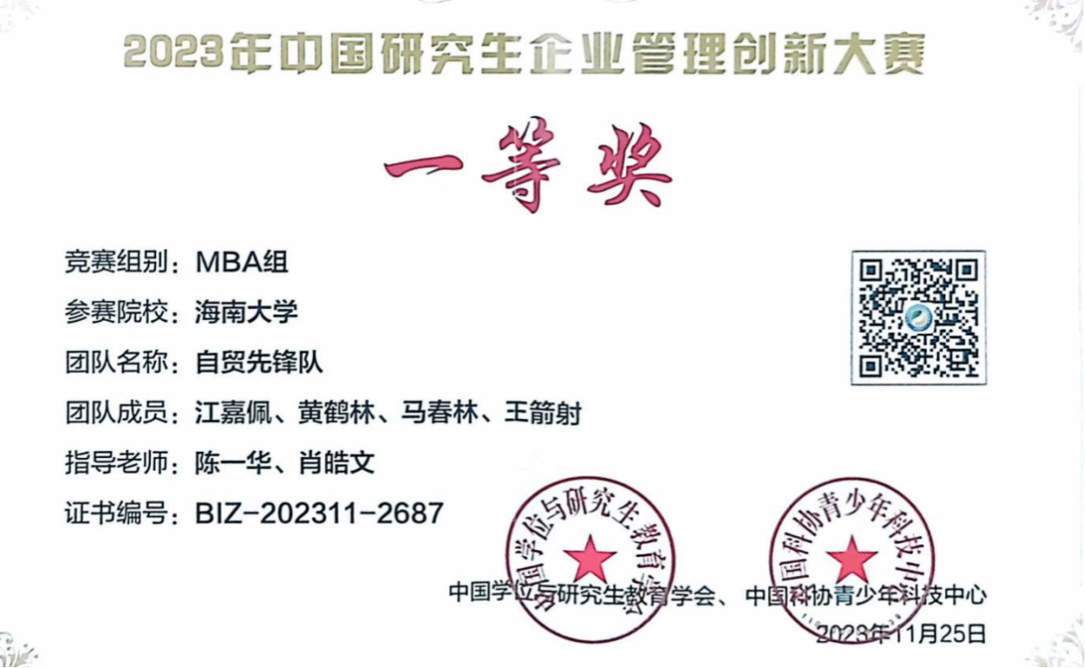 MBA代表队“自贸先锋队”(队员:江嘉佩、王箭射、马春林、黄鹤林)在陈一华、肖皓文两位老师的指导下荣获“2023年中国研究生企业管理创新大赛一等奖”。同时,水仙直播
