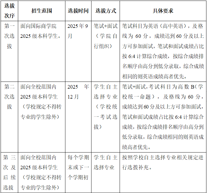 本次选拔分两阶段,第一阶段,院内选拔;若第一次选拨人数不足60人,进入第二阶段,以学校统一组织的学生自主选择专业形式进行,直至60人招满。具体安排如下表: