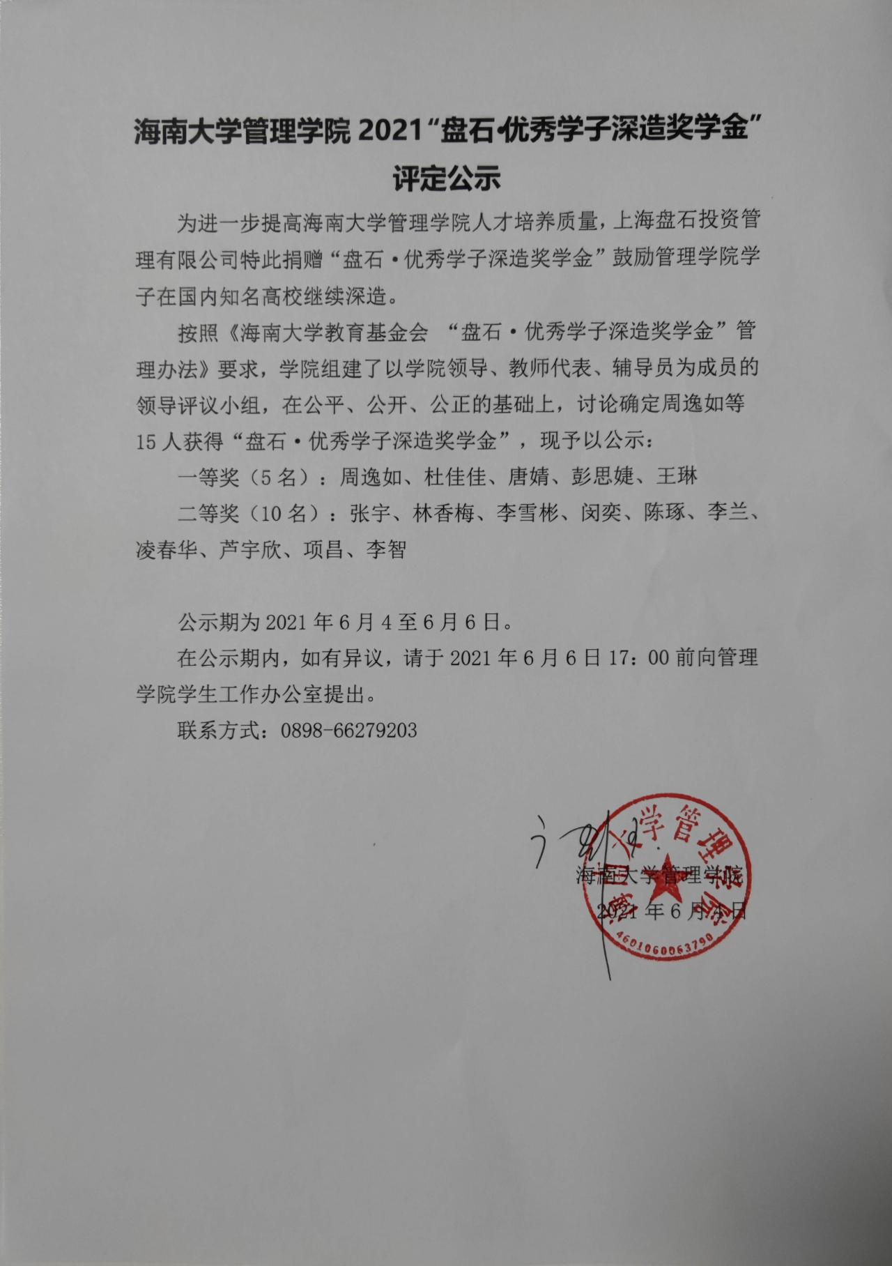 教育基金会“盘石·优秀学子深造奖学金”管理办法》要求,学院组建了以学院领导、教师代表、辅导员为成员的领导评议小组,在公平、公开、公正的基础上,讨论确定周逸如等15人获得“盘石·优秀学子深造奖学金”,现予以公示: