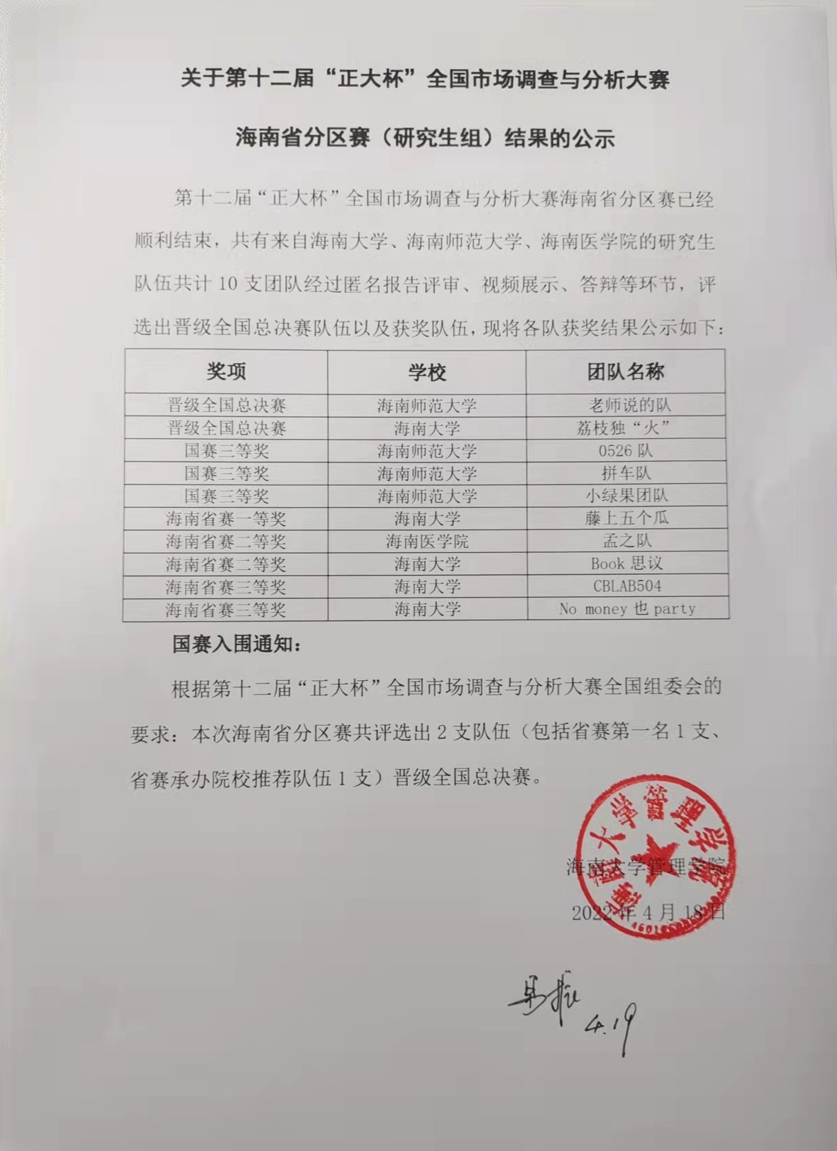 关于第十二届“正大杯”全国市场调查与分析大赛海南省分区赛(研究生组)结果的公示