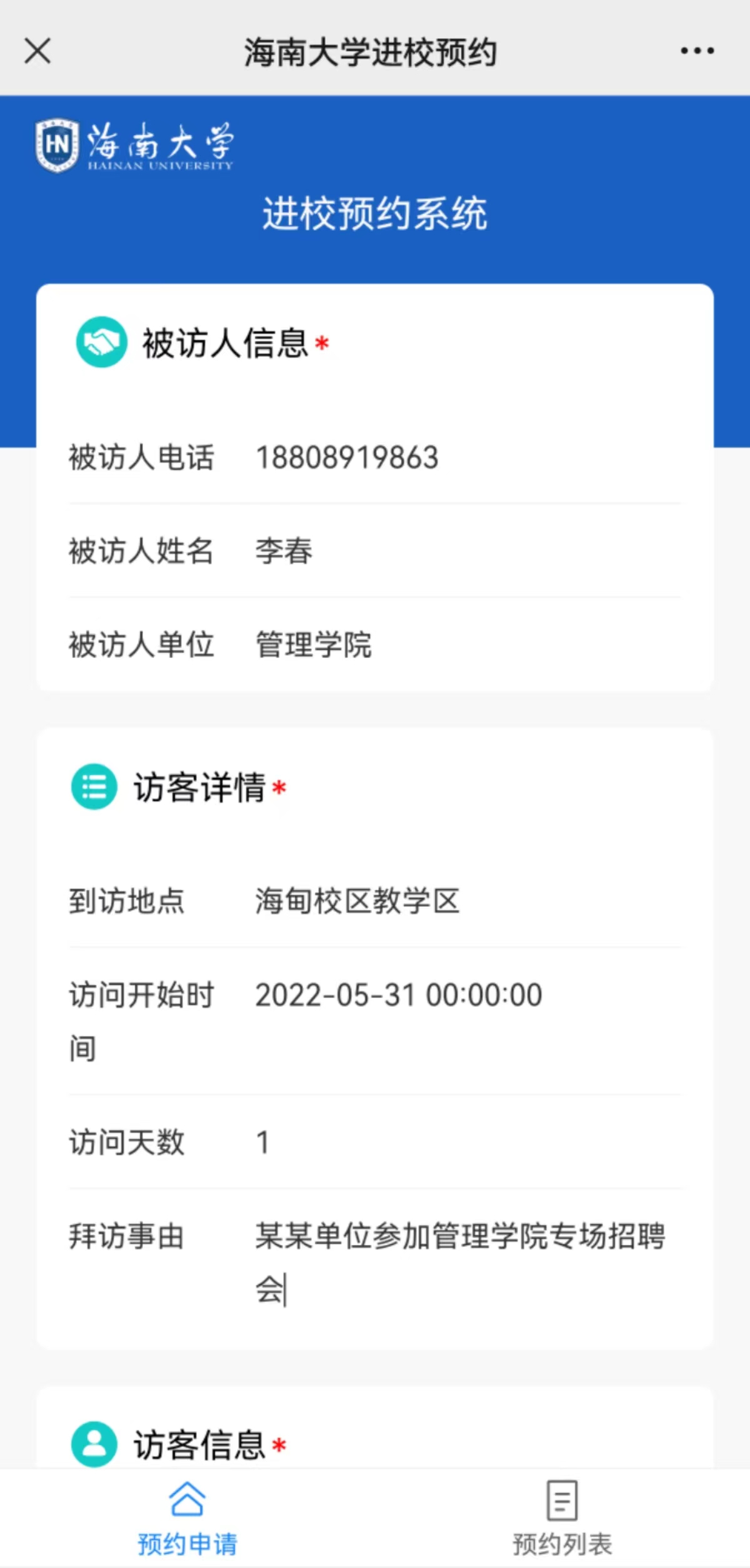 扫描上方二维码后被访人信息请按照下方的图片进行填写,来访事由处请写明具体的事项内容或进校原因,如因描述不清导致审核不通过请各用人单位自行负责:
