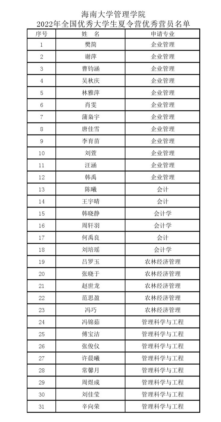 水仙直播 管理学院2022年全国优秀大学生夏令营“优秀营员”名单