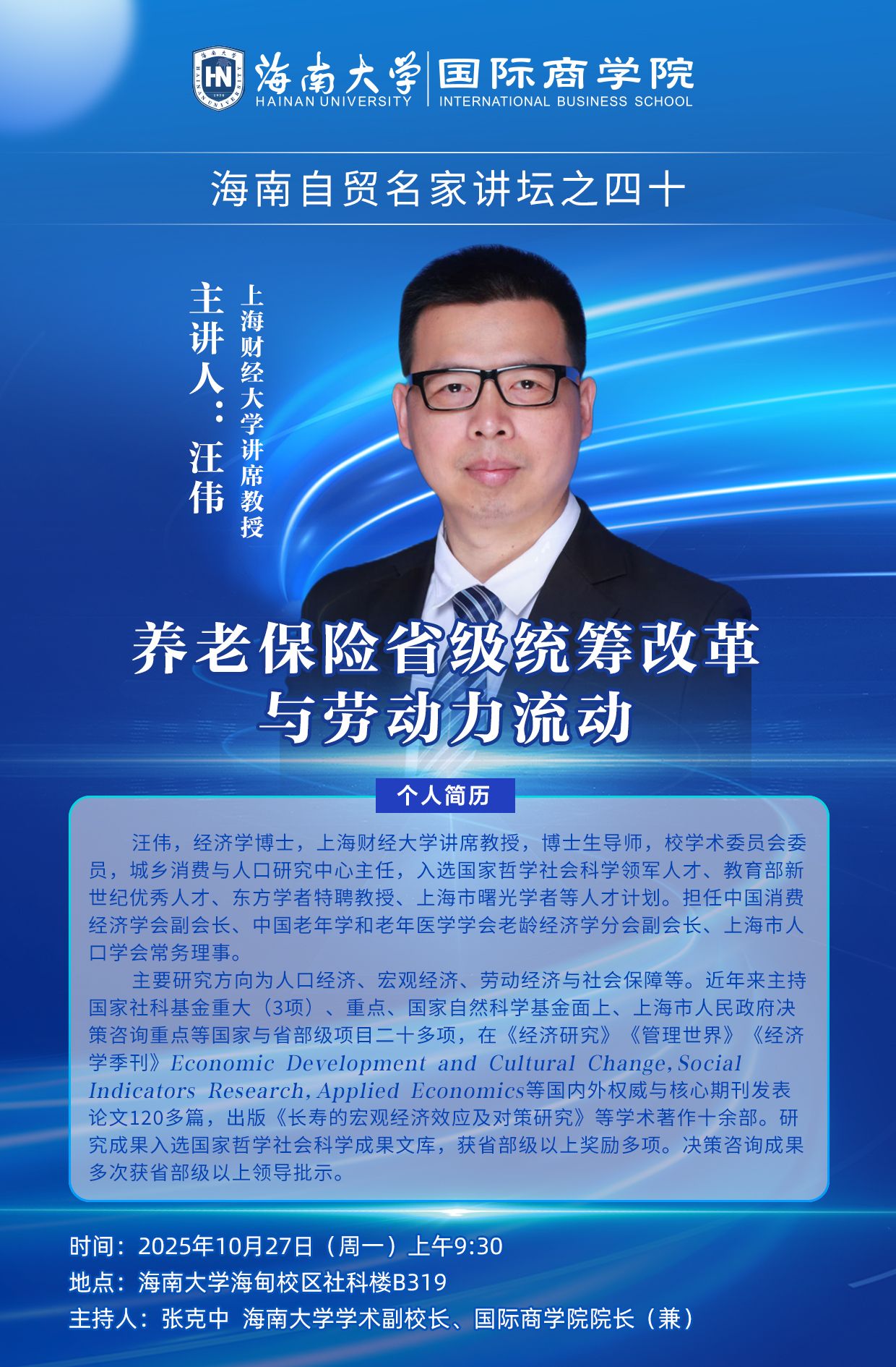 汪伟,经济学博士,上海财经大学讲席教授,博士生导师,校学术委员会委员,城乡消费与人口研究中心主任,入选国家哲学社会科学领军人才、教育部新世纪优秀人才、东方学者特聘教授、上海市曙光学者等人才计划。担任中国消费经济学会副会长、中国老年学和老年医学学会老龄经济学分会副会长、上海市人口学会常务理事。