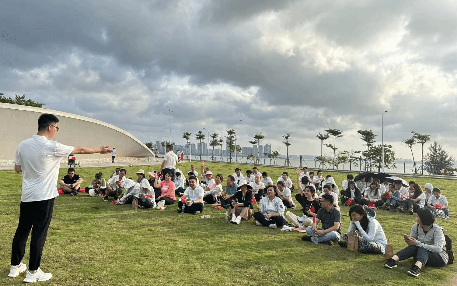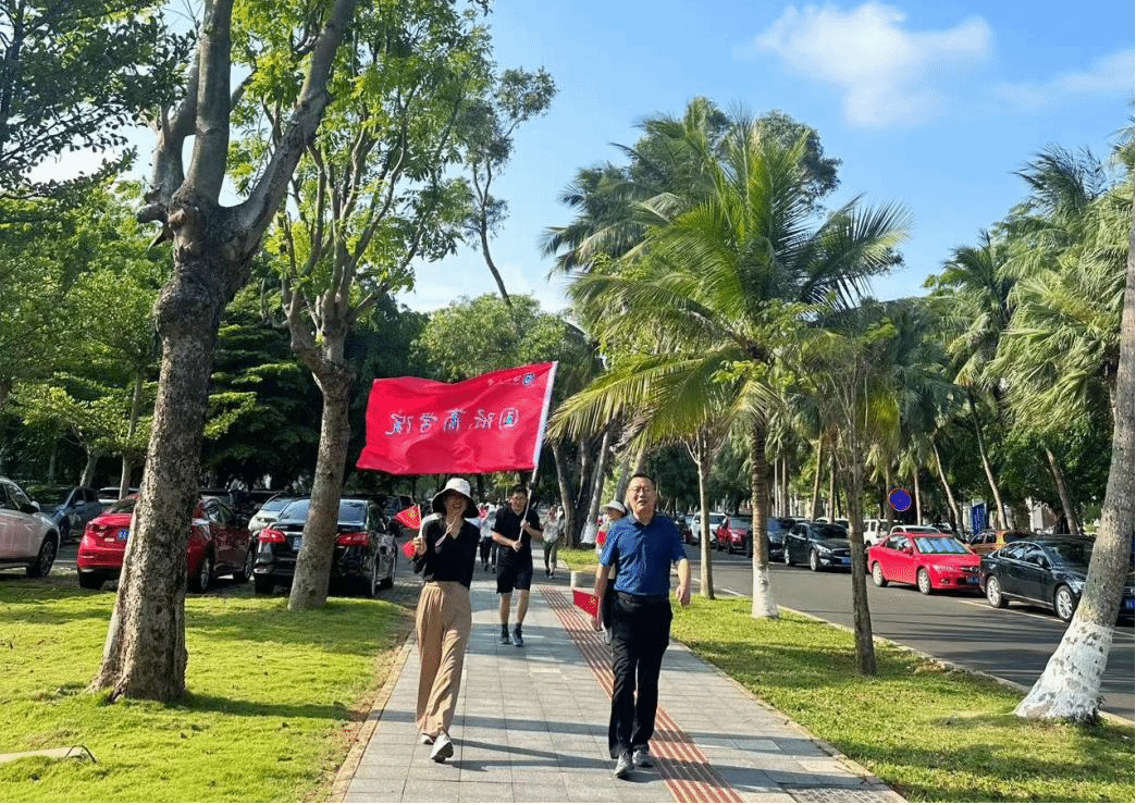 活动伊始,院党委书记南国芳、院长唐宁玉带领部分党员和教师从社科楼出发,步行至水仙直播 新南门与中国农业银行海口龙华支行团总支汇合,共同前往目的地天空之山。