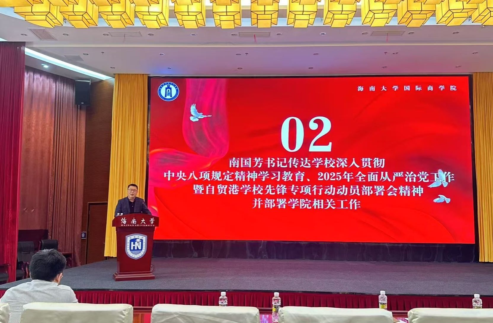 学院党委书记南国芳传达了学校深入贯彻中央八项规定精神学习教育、推动全面从严治党工作暨自贸港学校先锋专项行动动员部署会精神,并结合学院实际,部署了“深入贯彻中央八项规定精神学习教育”及“自贸港学校先锋专项行动”工作。会议强调,全体教职工需以更高站位落实中央八项规定精神,将廉政建设与业务工作同谋划、同推进,为海南自贸港建设培养德才兼备的高素质人才。