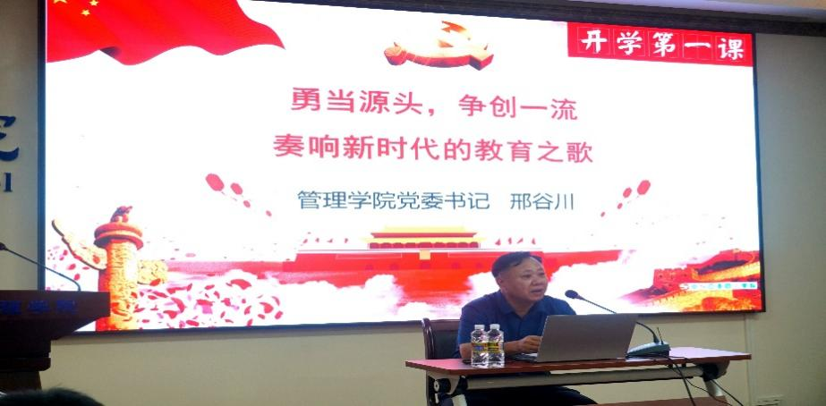 9月28号下午,管理学院在社科楼B112举办以“勇当源头,争创一流,奏响新时代的教育之歌”为主题的开学第一课。管理学院党委书记邢谷川、学院党委副书记易振、副院长付景涛和赵达出席,学院全体2021级研究生新生参加,活动由研究生辅导员李子昂主持。