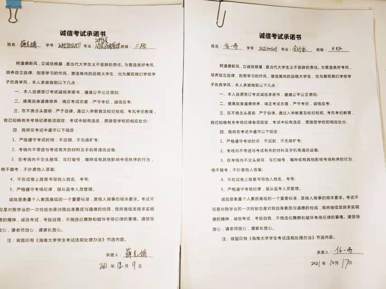 学生考试违规处理办法》,引导广大学生认真学习、诚信考试、诚信做人,并联系案例组织学生讨论,强化学生对考试违纪危害性的认识,通过多渠道宣传确保学生对考试纪律、考场规则应知尽知,并签署了诚信考试承诺书。