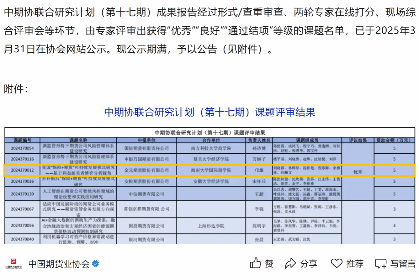 公示链接来源:中国期货业协会《关于中期协联合研究计划(第十七期)课题评审结果的公告》