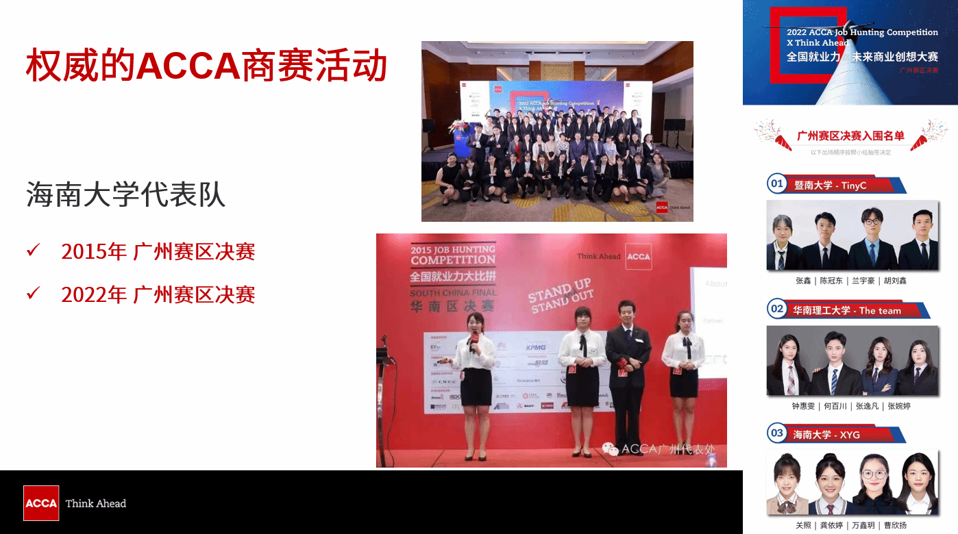 ACCA学生积极参与ACCA官方举办的各项活动,每年都有学生组队参加“ACCA全国就业力大比拼(JHC)”,并有专门的老师进行指导,学生们在比赛当中都学到很多东西。