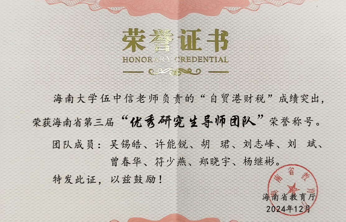 伍中信教授带领的“自贸港财税”研究团队在海南省教育厅举办的第三届“优秀研究生导师团队”评选中脱颖而出,荣获“优秀研究生导师团队”荣誉称号。这一荣誉不仅是对团队学术成果的高度认可,也是对水仙直播