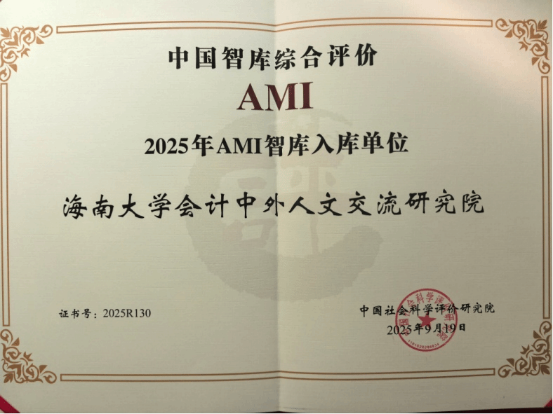 会计中外人文交流研究院(以下简称“研究院”)正式收到AMI(中国智库综合评价)入选证书。研究院凭借其在会计人文交流、国际化研究与政策咨询领域的突出贡献,成功入选核心智库榜单。这一里程碑标志着研究院在服务国家战略、推动中外文明互鉴方面获得了权威认可。